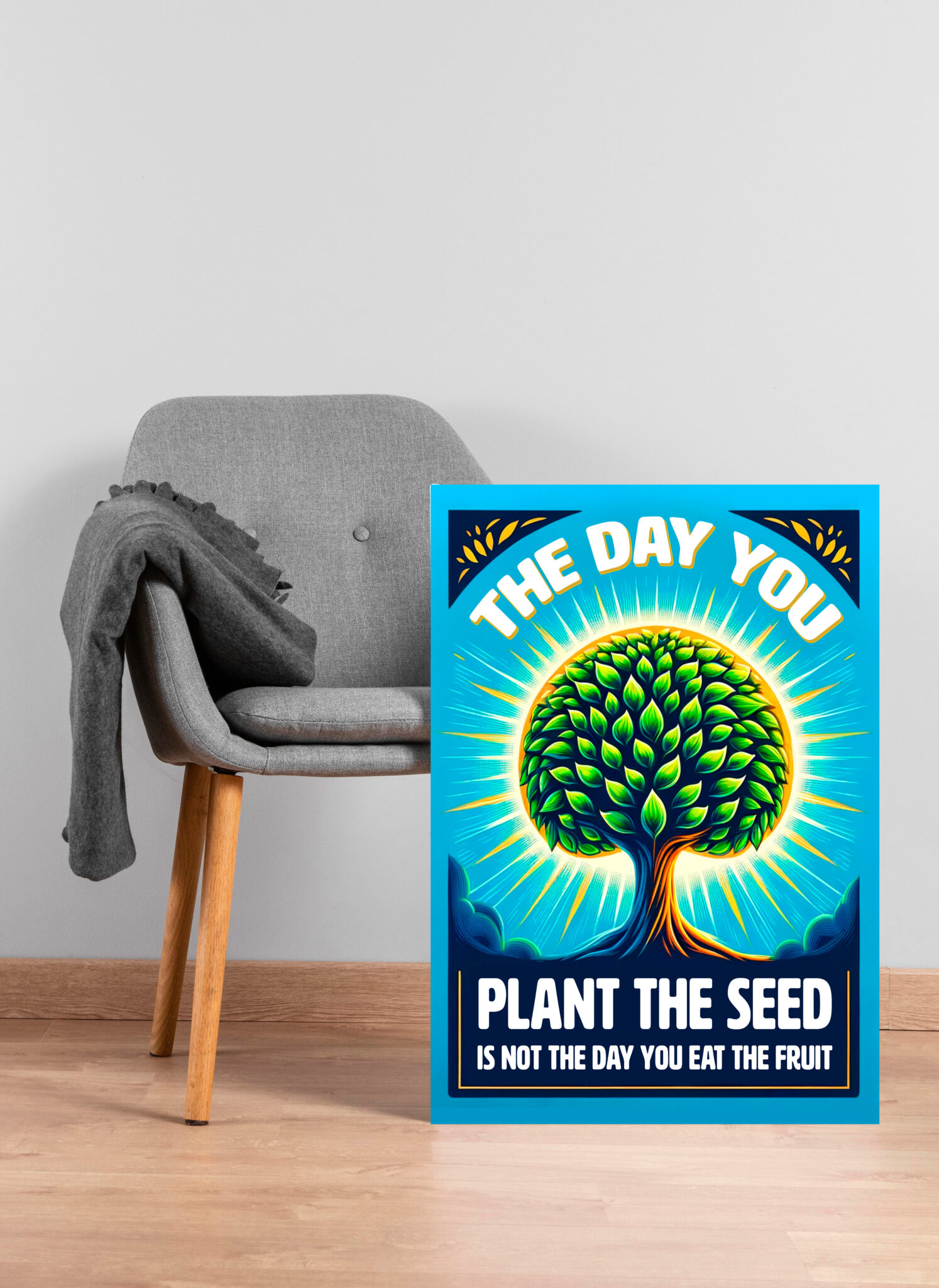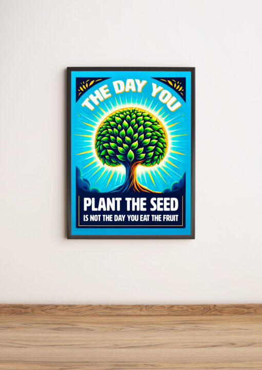 Elevate your space with the “Bright Beginnings” motivational poster or canvas, featuring the empowering quote, “The day you plant the seed is not the day you eat the fruit.” This vibrant artwork showcases a flourishing tree against a radiant blue sky, symbolizing growth, optimism, and the rewards of perseverance. Crafted with vivid greens, blues, and touches of sunny yellows, this poster is perfect for anyone seeking inspiration in their personal or professional journey. Ideal for office spaces, classrooms, or home offices, it serves as a daily reminder that patience leads to fruitful outcomes. Enhance your decor and stay motivated with this visually striking and thought-provoking piece.